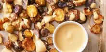 | Crispy Potatoes with Vegan Nacho Sauce chili dried/powder, canola oil, cashew, paprika, jalapeno, cumin, dried garlic, potato, salt, nutritional yeast, lemon juice This vegan nacho sauce is so good, it may even be better than cheese. Step 1 Preheat oven to 450 degrees F. Toss potatoes with oil, 1/2 teaspoon salt and 1/4 teaspoon pepper. On rimmed baking sheet, s...