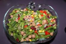 | Easy Bean Salad Recipe - Food.com white bean, red onion, red pepper, black beans, coriander leaf, kidney bean, peas, garlic, sweetcorn, mustard, salsa, rice vinegar This recipe is from the Cancer Project with a few alterations. Quick and easy prep! You can use any combination of beans, pinto, small red beans or black eyed peas all work well. Serving Size: 1 (234)...