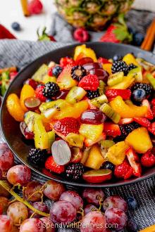 | Easy Fresh Fruit Salad - Spend With Pennies vanilla, cinnamon, pineapple, mandarin, grape, strawberry, kiwifruit, blueberry, raspberry, blackberry, sugar, water Berries, oranges, grapes, kiwis, & pineapple are mixed with simple syrup & cinnamon & served fresh. Fruit Salad is the ultimate summer salad! Bring water, sugar, vanilla and cinnamon stick...