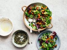 | Pumpkin Mixed Greens Salad With Maple Vinaigrette Recipe - Food.com pumpkin seeds, salad, olive oil, cooking spray, thyme, pepper, pumpkin, red wine vinegar, salt, maple syrup Cooking Light. Nov 06. Serving Size: 1 (34) g Servings Per Recipe: 4 AMT. PER SERVING % DAILY VALUE Calories: 71 Calories from Fat 48 g 68 % Total Fat 5.4 g 8 % Saturated Fat 0.8 g 4 % Choleste...
