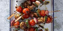 | Marinated Grilled Vegetable Kebabs Recipe | EatingWell red onion, olive oil, pepper, mushrooms, garlic, zucchini/courgette, tomato, balsamic vinegar, salt, seasoning Tender vegetables soak up this tangy marinade and turn delicately smoky and tender on a hot grill. These kebabs make a wonderful side dish with grilled meats or fish. Instructions Checklist Step 1 W...