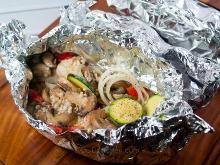 | Grilled Chicken and Vegetable Salad with Lemon and Pepper Vinaigrette - Mushroom Recipes shiitake mushroom, olive oil, thyme, pepper, carrot, spring onion, lettuce, mustard, salt, lemon juice Cool mixed greens topped with hot grilled chicken, carrots, and shiitake mushrooms make a great light meal. You can also let the grilled vegetables and chicken cool and serve them at room temperature....