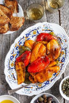 | Grilled Peppers and Onions Recipe red pepper, olive oil, pepper, oregano, orange, onion, balsamic vinegar, salt, sugar Grilled vegetables make a delicious condiment when used like a relish to top hot dogs, burgers, sandwiches, and other seasonal favorites, like our Grilled Sausages with Mix & Match Toppings (pictu...