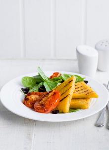 | Grilled polenta with tomato and olive salad recipe | olivemagazine black olive, polenta, vegetable stock, olive oil, tomato, spinach, red wine vinegar A simple Italian dish made with polenta. Cook in advance, then cut into wedges and grill. Serve with a tomato and olive salad as a light starter or supper. STEP 1 Bring the stock to a simmer and pour...