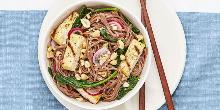 | Soba Salad with Grilled Tofu peanut, pepper, radish, spinach, salt, ponzu, firm tofu, noodles Make your own ponzu with 3 tablespoons soy sauce and 1 tablespoon lime juice. Step 1 Cut tofu into 1/2 inch thick slices; press dry with paper towels. Season with salt and pepper. Grill on medium-high...