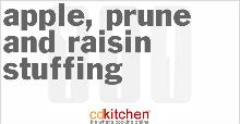 | Apple, Prune And Raisin Stuffing Recipe | CDKitchen.com butter, paprika, cinnamon, lemon, raisin, prune, apple, salt, bread crumbs, vegetable fat spread, brown sugar, apple cider, apple juice A recipe for Apple, Prune And Raisin Stuffing made with tart apples, prunes, raisins, bread crumbs, butter or margarine, brown sugar, lemon Mix all of the ingredients together. Use as stuffing for chi...