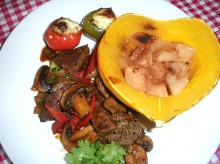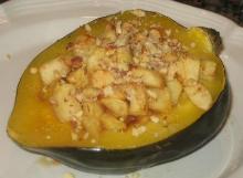 | Apple Stuffed Acorn Squash Recipe, Whats Cooking America butter, acorn squash, nuts, cinnamon, apple, brown sugar, lemon juice, water Stuffed acorn squash, this almost tastes like you are eating dessert! Enjoy the delicious flavors of Fall with this easy Apple Stuffed Acorn Squash Recipe. Heat oven to 350 degrees F. T o make Apple ...