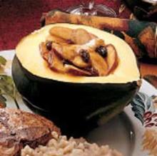 | Apple Raised Stuffed Acorn Squash Recipe butter, acorn squash, cinnamon, raisin, apple, onion, cheddar cheese, brown sugar This recipe came from an estate sale. I obtained it when I purchased the family collection from the Wasserstrum Estate in Duncanville, Texas in 1991. Preheat oven to 350. Cut squash in half lengthwis...