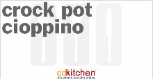 | Crock Pot Cioppino Recipe | CDKitchen.com tomato sauce, green bell pepper, olive oil, thyme, pepper, parsley, paprika, oregano, cayenne pepper, basil, onion, garlic, tomato, scallop, mussel, clam, prawn, cod, bass, fish, salt, white wine A 5-star recipe for Cioppino made in the crock pot made with crushed tomatoes, tomato sauce, onion, white wine, olive oil, garlic, parsley, green bell Place all ingredients except seafood in crockpot....