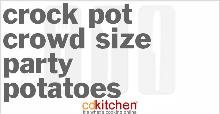 | Crowd-Size Crock Pot Party Potatoes Recipe | CDKitchen.com taco shell, hash brown, mushroom soup, green chili, spring onion, tortilla chips, monterey jack cheese, sour cream A recipe for Crowd-Size Party Potatoes made in the crock pot made with cream of mushroom soup, sour cream, green chiles, Colby-Monterey jack cheese, frozen Spray 4- to 6-quart slow cooker with cooking...