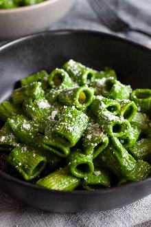 | Spinach Pesto with Pasta – Easy Pesto Recipes - Pasta Recipes lemon peel, olive oil, almond, pepper, garlic, spinach, salt, parmesan cheese, pecorino cheese, pasta Cook the pasta according to package directions. Reserve 1/2 cup of the cooking liquid, drain the pasta and return it to the pot. Meanwhile, in a food processor, pulse the almonds, garlic and lemon ze...