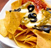 Nachos - Snacks - Easy Recipes black olive, banana pepper, refried beans, tomato, salsa, tortilla chips, cheddar cheese, sour cream This dish, Not- Yo Nachos, is so good you'll be tempted to not share it. Set the toaster oven to broil. Spread the chips on the baking sheet. Use the spoon to distribute the refried beans, tomatoe...