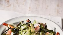 | Prawn & Cucumber Noodle Salad - Healthy & Easy Recipes | House & Garden seaweed, dashi, rice wine, sesame seed oil, sesame seed, ginger root, wakame, nori, cucumber, prawn, soy sauce, rice vinegar, mirin, noodles, sugar Prawn & Cucumber Noodle Salad - Healthy & Easy Recipes Step 1 Halve the cucumber lenthways, scoop out the seeds, then use a vegetable peeler to cut it into long, thin strips. Place in a colan...