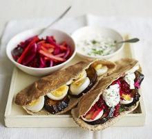 | Egg & veggie pittas recipe | BBC Good Food red onion, hot sauce, pitta bread, olive oil, dill, carrot, beetroot, garlic, aubergine/eggplant, eggs, red wine vinegar, fat, agave syrup, sugar, yogurt (plain) Cram wholemeal bread pockets with healthy aubergine, beetroot and carrot, then add a garlic and dill yogurt and eggs STEP 1 Heat oven to 220C/200C fan/gas 7. Put the aubergine slices on a baking shee...