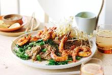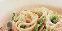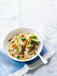 | Shrimp and Noodle Salad with Ginger Dressing Recipe | MyRecipes coleslaw, teriyaki sauce, chili garlic sauce, oil, ginger root, coriander leaf, lime, spring onion, shrimp, salt, noodles Instead of spending time shredding cabbage and carrots, Grace Parisi uses prepackaged coleslaw mix. She tosses it with noodles and shrimp, then adds a spicy, gingery dressing prepared with other easy-...
