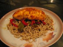 | Ginger-Soy Salmon With Soba Noodles Recipe - Food.com rice wine, red pepper, snap/snow peas, ginger root, spring onion, salmon, soy sauce, mirin, noodles This is a yummy Japanese recipe that I love! It's SOO easy to make, and it turns out great! Serving Size: 1 (426) g Servings Per Recipe: 2 AMT. PER SERVING % DAILY VALUE Calories: 579.9 Calori...