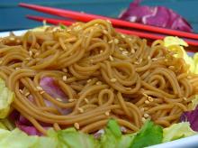 Ginger Noodles Recipe - Food.com chili paste, sesame seed oil, sesame seed, ginger root, spring onion, soy sauce, rice vinegar, pasta, honey Important to use fresh ginger. Great with asian veggies. Serving Size: 1 (153) g Servings Per Recipe: 3 AMT. PER SERVING % DAILY VALUE Calories: 398 Calories from Fat 49 g 12 % Total Fat 5.5 g 8 ...