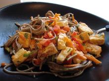 Ginger Soba Noodles Recipe - Food.com dressing, red bell pepper, sesame seed oil, canola oil, ginger root, carrot, spring onion, soy sauce, rice vinegar, firm tofu, noodles, sugar This is a delicious cold salad inspired by the sesame noodles served at my favorite deli. It can be served as a side dish or a healthy, vegan main course. The 4 servings listed are for small main cour...