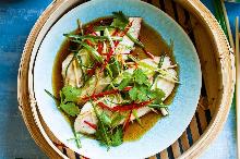 | Steamed sea bream with spring onion and ginger - Recipes - delicious.com.au light soy sauce, sesame seed oil, ginger root, coriander leaf, green chili, spring onion, rice vinegar, rice, sugar Use the bright flavours of Asia to make this fast, fresh midweek dinner. 1. Place a plate inside a bamboo steamer and lay the fish, skin-side down, on the plate. Place the soy sauce, sesame oil, suga...