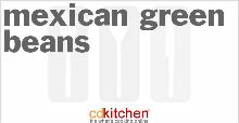 | Mexican Green Beans Recipe | CDKitchen.com chili dried/powder, garlic salt, oil, green beans, salt, cheddar cheese, water, flour A recipe for Mexican Green Beans made with oil, flour, chili powder, water, salt, garlic salt, frozen green beans, cheddar In saucepan, heat oil. Brown flour. Dissolve chili powder in water. Add to fl...