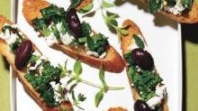 | Bruschetta with Kalamata Olives, Braised Greens, and Ricotta Recipe | Bon Appetit broccoli raab, kalamata olive, red pepper, ricotta cheese, olive oil, oregano, garlic, bread Bruschetta with Kalamata Olives, Braised Greens, and Ricotta Recipe Step 1 Cook broccoli rabe in boiling salted water until tender, 5 to 6 minutes. Drain well. Heat 2 tablespoons oil in large skillet...