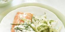 | Chilled Salmon with Green Olive Sauce Recipe olive oil, pepper, chives, olive, fennel, salmon, salt, white wine, lemon juice, yogurt (plain), water This chilled salmon looks and tastes very elegant and is ready in 15 minutes. Step 1 In 8-inch by 8-inch glass baking dish, arrange fennel in single layer, then place salmon fillets on top. Sprinkle w...