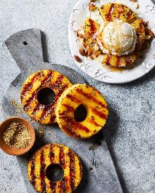 | Rum- Spiked Grilled Pineapple With Toasted Coconut Recipe butter, pineapple, coconut, brown sugar, vanilla ice cream, spiced rum Only 6 ingredients for this delicious dessert. Ready in 10 mins. Combine sugar and rum in microwave-safe bowl Microwave at High 1-1/2 mins or until sugar dissolves. Brush rum mixture evenly over pinea...