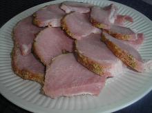 | Baked Ham Slices Recipe - Food.com mustard powder, pork, brown sugar, apple juice This ham is very tender. You could cut it with a fork. Lots of flavour. Serving Size: 1 (67) g Servings Per Recipe: 4 AMT. PER SERVING % DAILY VALUE Calories: 110.8 Calories from Fat 2 g 2 % Tota...